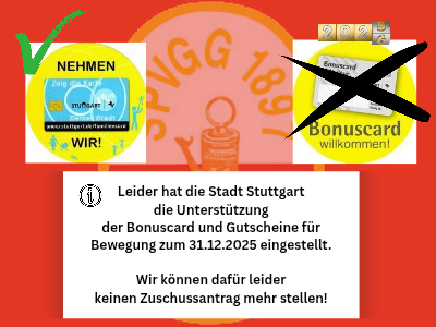 Leider hat die Stadt Stuttgart ab 2026 die Untersützung im Sport für Bonuscard +Kultur und Gutscheine für Bewegung (4 bis 17 Jahre) eingestellt. Wir können daher keine Zuschussanträge mehr für unsere Mitglieder stellen.