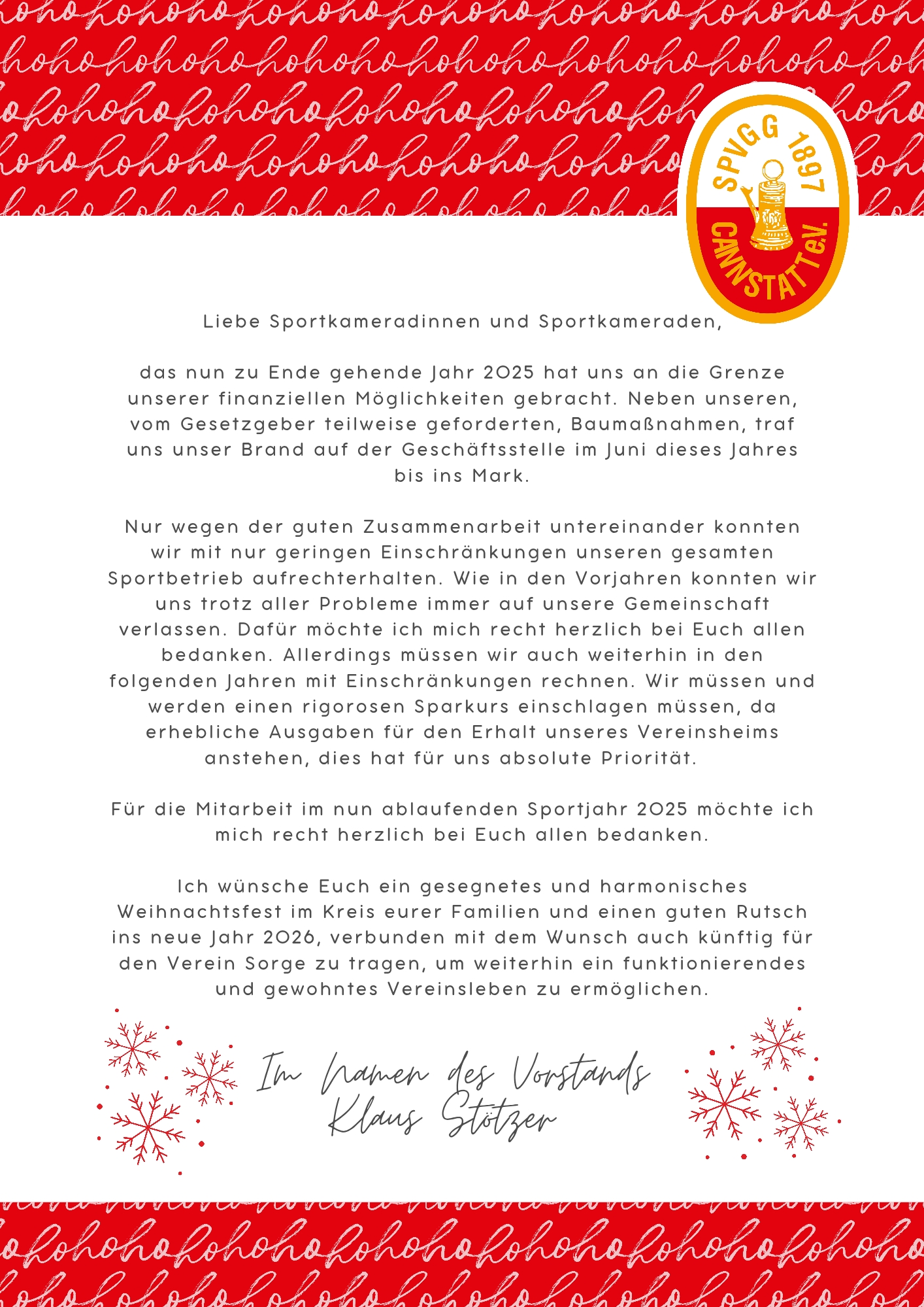 Der Vorstand wendet sich in einem Weihnachtsbrief an alle Mitglieder:
